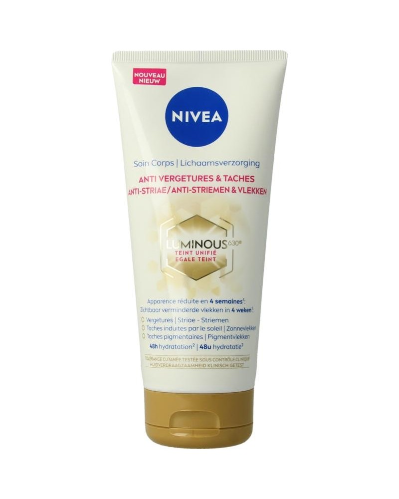 De multifunctionele anti-striae & vlekken verzorging van NIVEA is licht van textuur, en een snel absorberende formule die je huid 48 uur lang hydrateert en verzorgt. Regelmatig gebruik vermindert de zichtbaarheid van striae, zonnevlekken en pigmentvlekken in 4 weken*. De formule met het gepatenteerde ingrediënt LUMINOUS630® brengt de natuurlijke melanineproductie van de huid weer in balans en verzacht het contrast tussen striae en de omringende huid waardoor striae minder zichtbaar wordt.