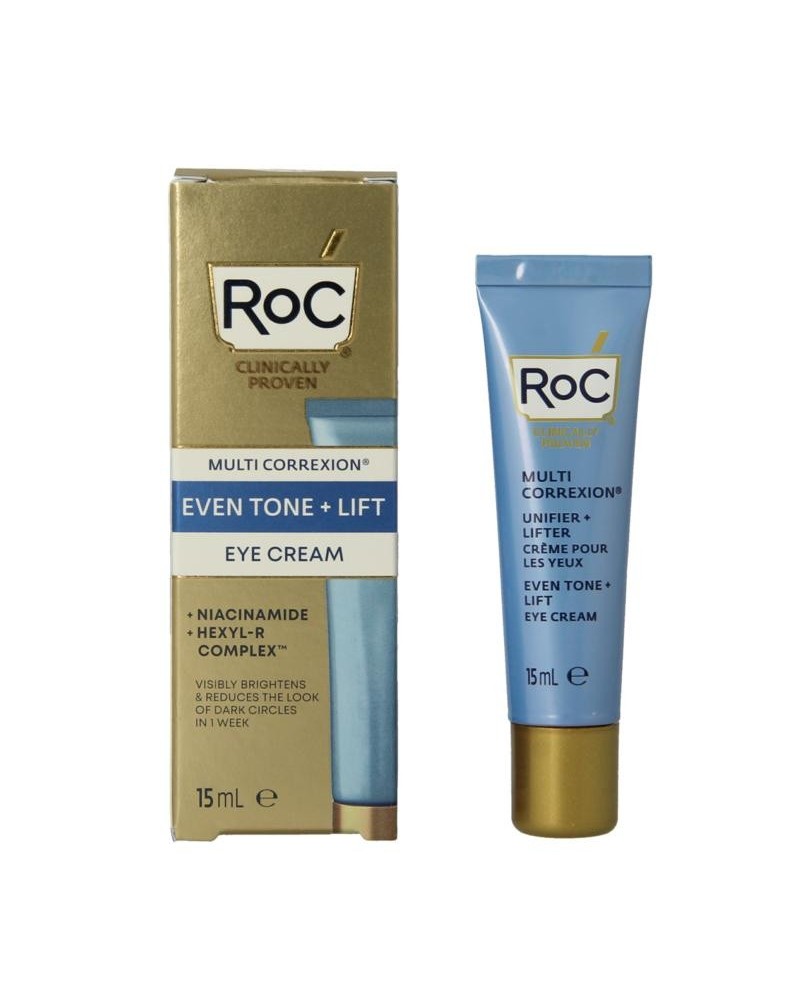 Deze oogcrème met Niacinamide is klinisch bewezen om uw gehele ooggebied te verhelderen. Ontworpen met twee krachtige antioxidanten - Niacinamide en RoC's® gepatenteerde Hexyl-R Complex™ technologie - helpt deze snel absorberende oogcrème voor donkere kringen om verkleuring en een ongelijkmatige teint aan te pakken, terwijl het zichtbaar het uiterlijk van meerdere tekenen van veroudering verbetert, waaronder donkere kringen, kraaienpootjes en stevigheid.