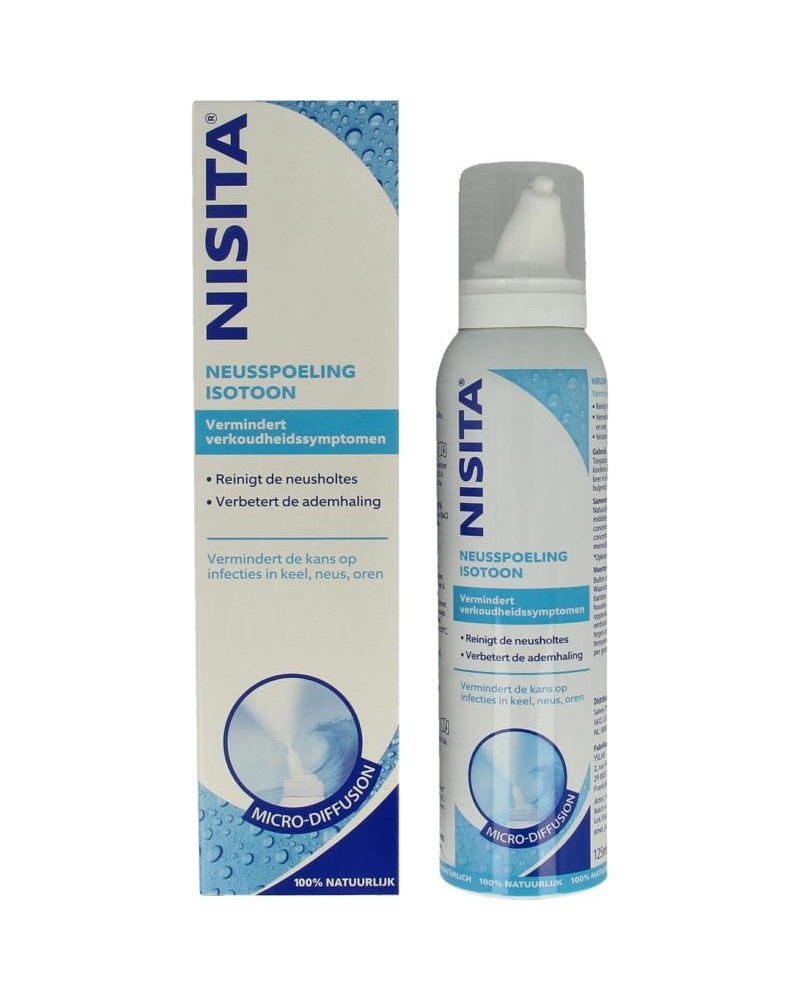 Het regelmatig onderhouden van de neushygiëne vermindert de kans op verkoudheid, sinusitis, rhinitis en allergieën. Nisita® neusspoeling isotoon micro-diffusion reinigt de neusholtes, vermindert de kans op infecties en verbetert daardoor de ademhaling. Een dagelijkse toepassing houdt het natuurlijke evenwicht in stand en verwijdert stof en allergenen en voorkomt uitdroging van het neusslijmvlies. Het biedt een comfortabel ademgevoel. De microdiffusie van de zoutoplossing geeft een zachte en effectieve reiniging. De zoutoplossing in Nisita® neusspoeling isotoon is afkomstig uit de van nature schone omgeving langs de Bretonse kust in Frankrijk.