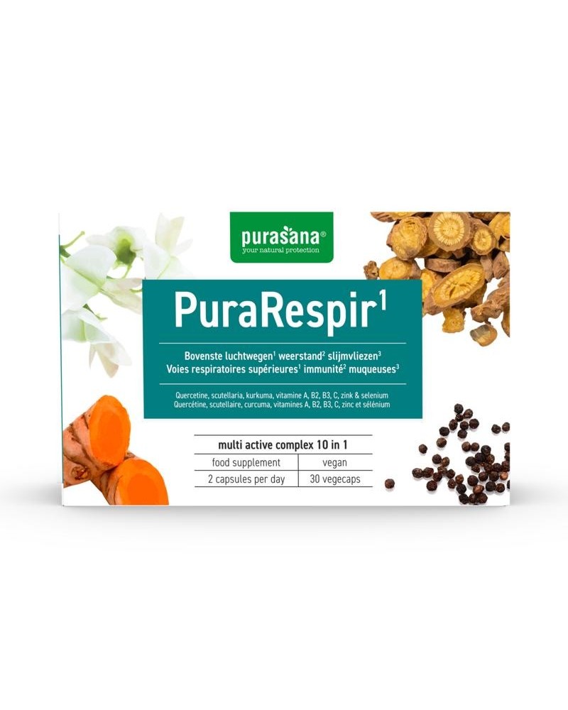 PuraRespir is een 10-in-1 nutraceutical supplement dat bijdraagt tot normale slijmvliezen, luchtwegen en weerstand dankzij ingrediënten zoals scutellaria, quercetine, kurkuma* en vitamine A.