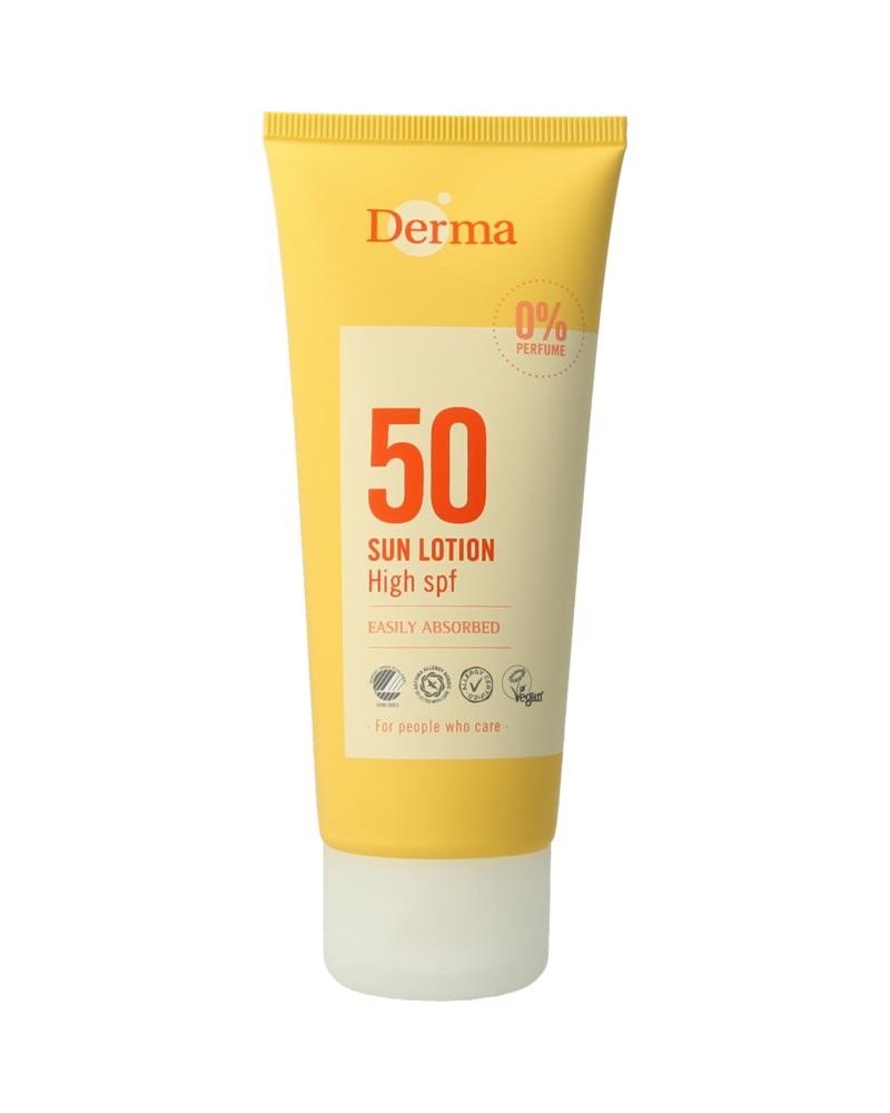 Derma Sun lotion SPF50 biedt een hoge bescherming tegen de zon en wordt aanbevolen voor langer verblijf in de zon, zoals skiën, wandelen en andere buitenactiviteiten. De zonnebrandcrème is waterproof en voldoet aan de EU-aanbevelingen voor optimale UVA- en UVB-bescherming.