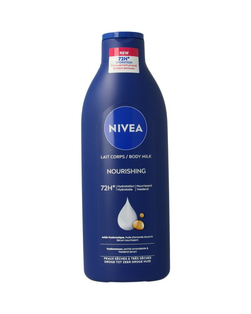 NIVEA Verzorgende Body Milk nu met een verbeterde formule met 100% puur hyaluronzuur, amandelolie en een voedend serum. De formule hydrateert de huid 72 uur lang. Voor een gezond uitziende huid bij elk gebruik.