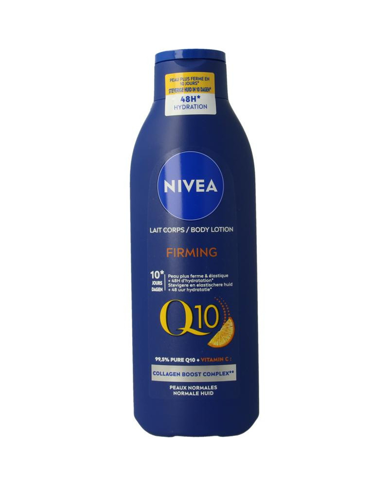 De NIVEA Q10 verstevigende Body Milk met Collageen Boost Complex** met 99,5% pure Q10 + vitamine C verstevigt de huid zichtbaar en verbetert de elasticiteit vanaf 10 dagen. Het hydrateert de huid 48uur lang en geeft een aangename geur.
