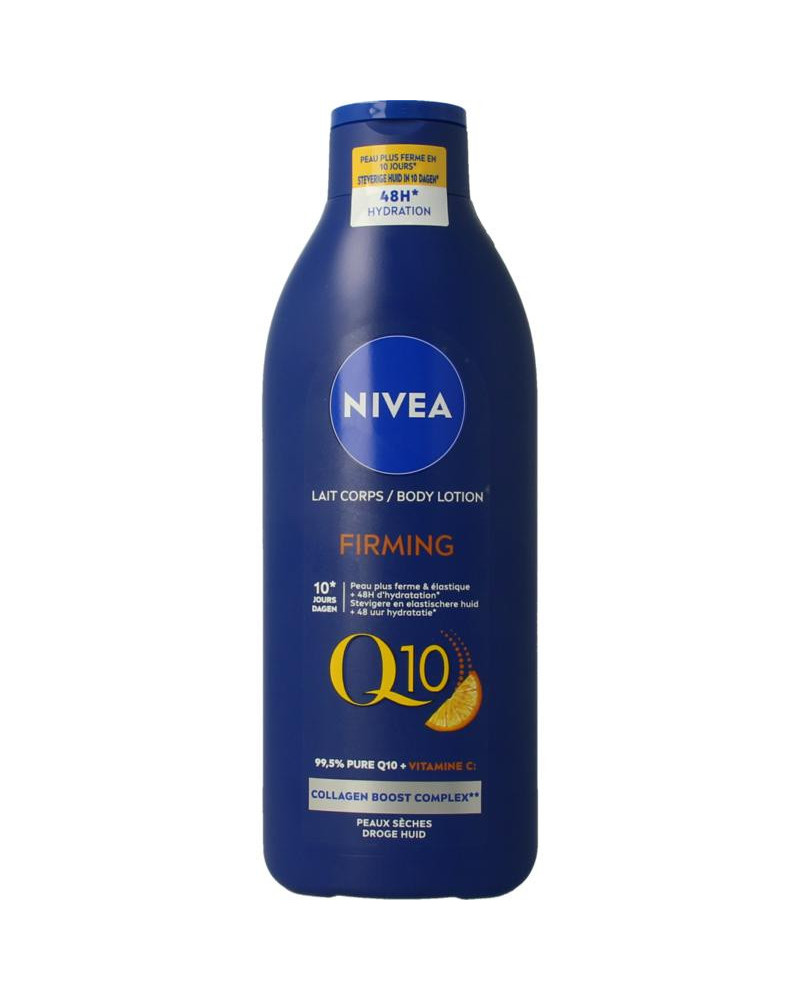 De NIVEA Q10 verstevigende Body Milk met Collageen Boost Complex** met 99,5% pure Q10 + vitamine C verstevigt de huid zichtbaar en verbetert de elasticiteit vanaf 10 dagen. Het hydrateert de huid 48uur lang en geeft een aangename geur.