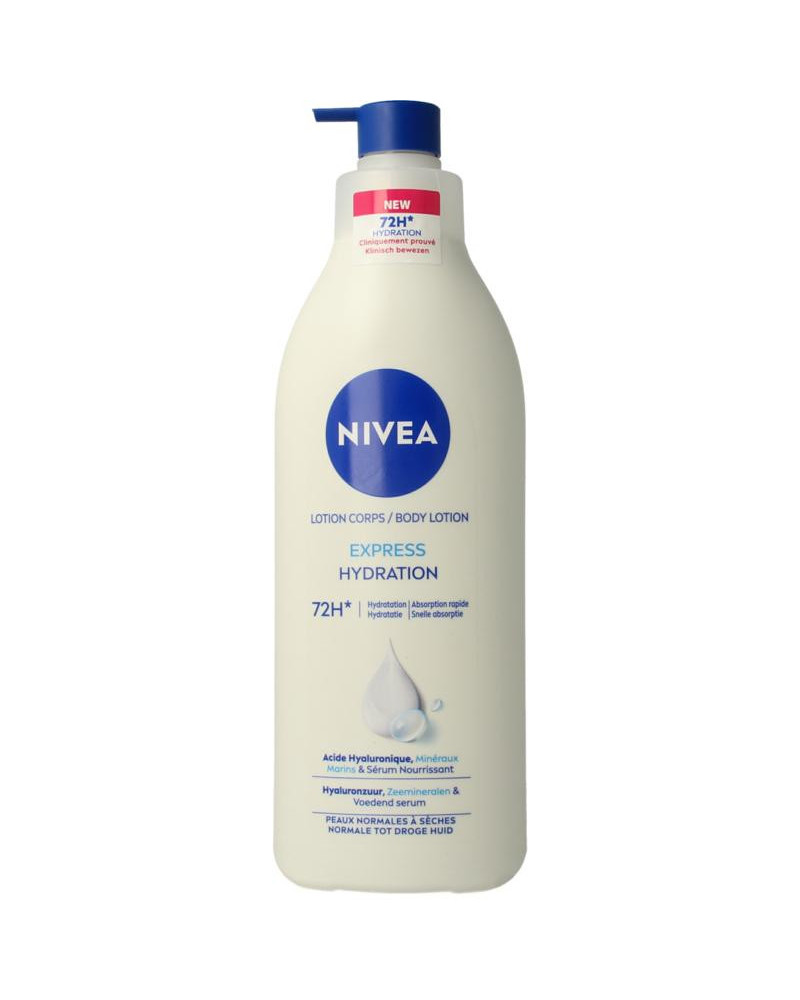 De NIVEA Express Body Lotion nu met een verbeterde formule met 100% puur hyaluronzuur, zee mineralen en voedend serum voor een gezond uitziende huid bij elk gebruik. Het hydrateert je huid voor 72uur lang en laat de huid gladder en zachter aanvoelen.