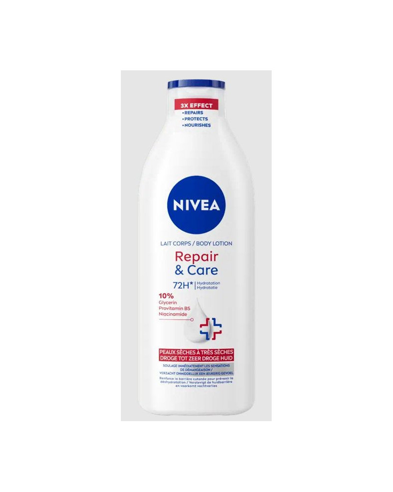 NIVEA Repair & Care Lotion versterkt je huidbarrière. De huidverdraagzaamheid is dermatologisch goedgekeurd. De formule heeft 3x effect – ondersteunen, beschermen en voeden - biedt de verzorging die je huid nodig heeft. De lotion bevat 10% Glycerine complex en Provitamine B5 en Niacinamide. Verzacht een jeukerig huidgevoel onmiddellijk. NIVEA Repair & Care intensieve lotion is perfect voor de droge en zeer droge huid. Het biedt tot 72 uur hydratatie. Het heeft een niet-vettige textuur en absorbeert snel. Voor het beste resultaat raden we aan om deze bodylotion dagelijks op je hele lichaam aan te brengen