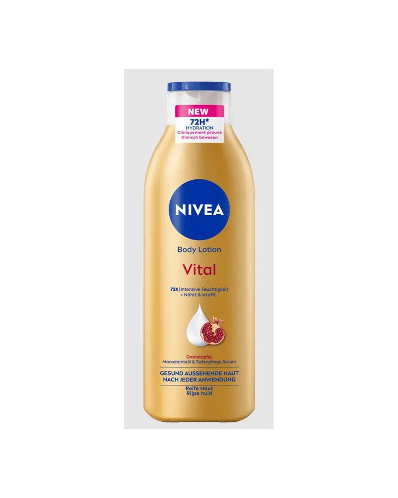 Zorg voor je huid met de NIVEA Vital Body Lotion, met de nieuwe en verbeterde formule die klinisch bewezen 72 uur hydratatie biedt. Voor een gezond uitziende huid bij elk gebruik. Voedende formule met serum, granaatappel- en macadamiaolie. Deze bodylotion zorgt voor een stevigere en merkbaar gladdere huid en is perfect voor de rijpere huid. Niet vet en trekt snel in. Een rijpere huid wordt vaak geassocieerd met een droge huid. Daarom is het belangrijk om je huid het hele jaar door extra te verzorgen. Wees er voor je huid met de NIVEA Vital bodylotion.