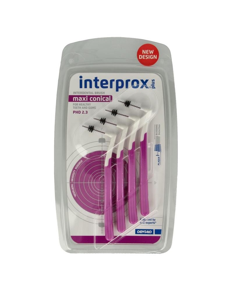 Interprox Plus Maxi Conical Paars is speciaal ontwikkeld voor het reinigen van de ruimten tussen tanden vóór in de mond. Cariës (gaatjes) en tandvleesontstekingen beginnen vaak tussen tanden en kiezen. Deze ruimte reinig je het meest effectief met een interdentaal borsteltje. Een borsteltje is effectiever dan tandenstokers of rubbersticks. De borsteltjes van Interprox zijn voor dagelijks gebruik en gaan langer mee. Omdat de interdentale ruimten tussen tanden en kiezen varieert, is het belangrijk om voor iedere specifieke situatie het meest geschikte borsteltje te kiezen. Vraag je mondzorgprofessional welke maat het meest geschikt is. Interprox Plus Maxi Conical Paars heeft een gehoekt handvat en beschikt over een cylindrisch gevormde borstelkop met PHD maat 2.3.