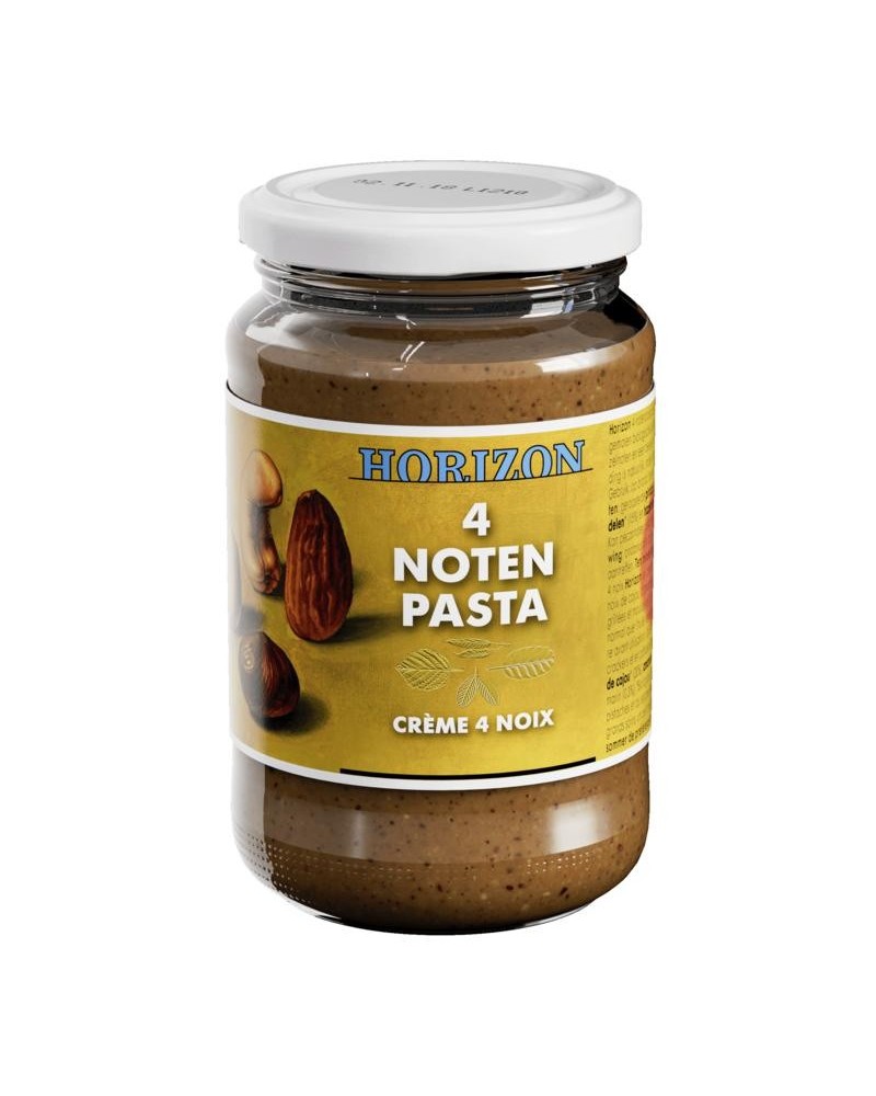 Horizon 4 Notenpasta bestaat uitsluitend uit vers geroosterde en gemalen biologische hazelnoten, amandelen, cashewnoten, pinda's en een beetje zeezout. Verder niets.