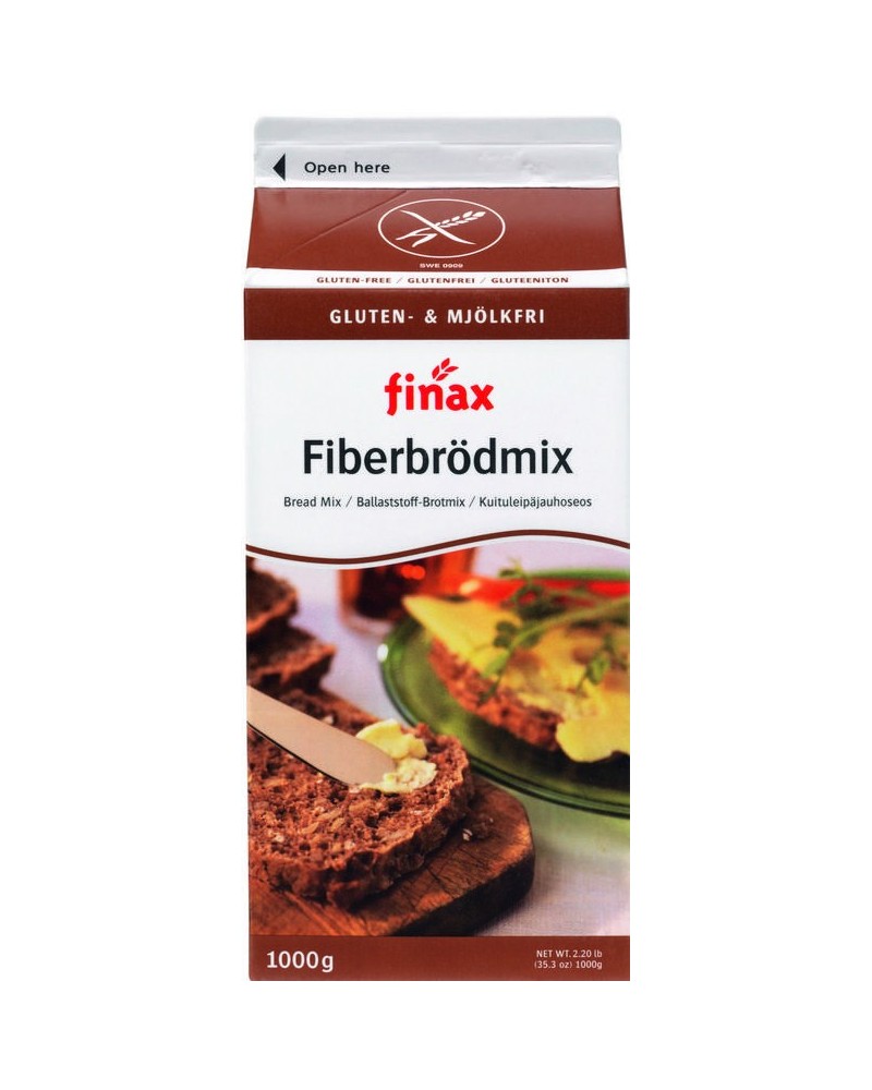 Heerlijke glutenvrije vezelbroodmix (bruin pak) van het merk Finax. Je hoeft enkel water toe te voegen. Met 1000 gram glutenvrije broodmix in de verpakking kun je meerdere lekker stevige, volkoren & vezelrijk broden bakken.