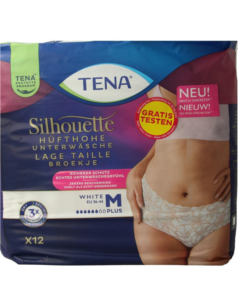 Vrouwelijk, discreet, wit incontinentieondergoed voor vrouwen dat eruitziet als lingerie. TENA Silhouette Low Waist Blanc heeft een elegant patroon over het hele ondergoed en een lage lingerie tailleband die past bij elke stijl. Krijg de bescherming die u nodig hebt bij matig tot zelfs zwaarder urineverlies met dit elegante, stijlvolle vrouwelijke incontinentieondergoed met lage lingerie tailleband voor een echt ondergoed gevoel.