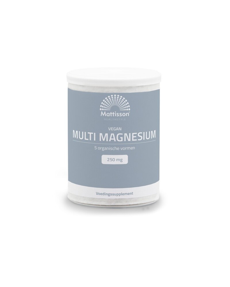 Mattisson Multi Magnesium poeder is een mix van 5 verschillende magnesiumvormen: Magnesium Citraat, Malaat, Tauraat, Bisglycinaat en Aquamin® Magnesium. Dit product bevat 250 mg elementair magnesium per dosering van 2g.