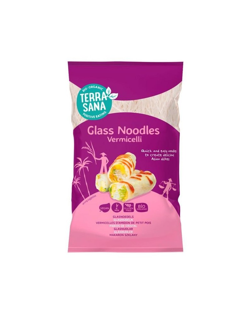 Glasnoedels zijn ideaal om altijd in je keuken te hebben. Het zijn dunne vermicelli-noedels, gemaakt van erwten. Glasnoedels worden veel gebruikt in Thaise als Vietnamese gerechten, maar ook in ‘Europese’ soepjes, salades of roerbakgerechten passen ze supergoed. Een ander mooi voordeel is dat deze biologische glasnoedels glutenvrij zijn. Ideaal als je van puur eten houdt zonder onnodige toevoegingen.