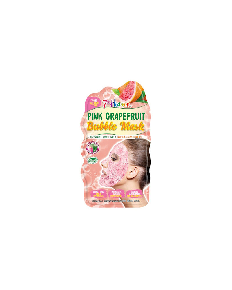7th Heaven Face Mask Pink Grapefruit Bubble Sheet is roze en heeft verrukkelijke bubbels! Verfrissende grapefruit vermengd met sappige frambozen vormen samen een fantastisch hydraterend gezichtsmasker. Bij blootstelling aan lucht borrelt en schuimt het om de huid schoon en fris te maken. Geschikt om wekelijks te gebruiken.