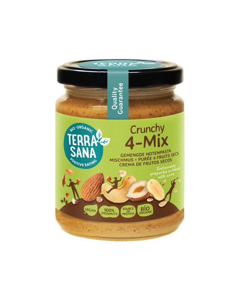De 4-mix crunchy is een lekker smeuïge notenpasta, gemaakt van biologische cashewnoten, hazelnoten, amandelen en pinda's, en verrijkt met knapperige stukjes voor extra bite. Je proeft elke noot apart, maar samen creëren ze een unieke smaakervaring die je nergens anders vindt.