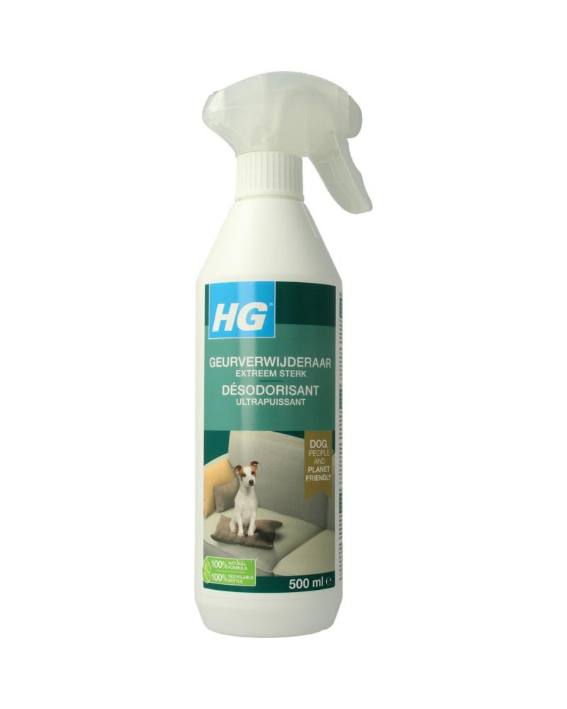 HG geurverwijderaar extreem sterk voor honden is de effectieve en snelle anti-hondengeurspray. Onmisbaar voor hondenbezitters. HG geurverwijderaar extreem sterk voor honden is speciaal ontwikkeld om onaangename geurtjes effectief te verwijderen uit bijvoorbeeld de hondenmand, stoelen, banken, het tapijt, de gordijnen en zelfs poreuze tegels of voegen. Deze extreem sterke spray tegen hondengeur maskeert de geur niet, maar neemt de stankbron weg. Dit doet onze hondengeurverwijderaar op een 100% biologische wijze. Het maak namelijk gebruik van natuurlijke enzymen en microben. Hiermee is het dus volledig veilig voor mens én dier. Het verwijdert onder andere geuren veroorzaakt door de vacht, urine, uitwerpselen en braaksel.