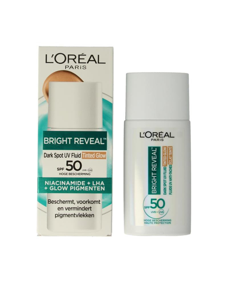 Ontdek de L'Oréal Paris Bright Reveal Daily UV Fluid Tinted Glow. Deze fluid beschermt, voorkomt en vermindert pigmentvlekken met behulp van niacinamide, LHA en glow pigmenten.