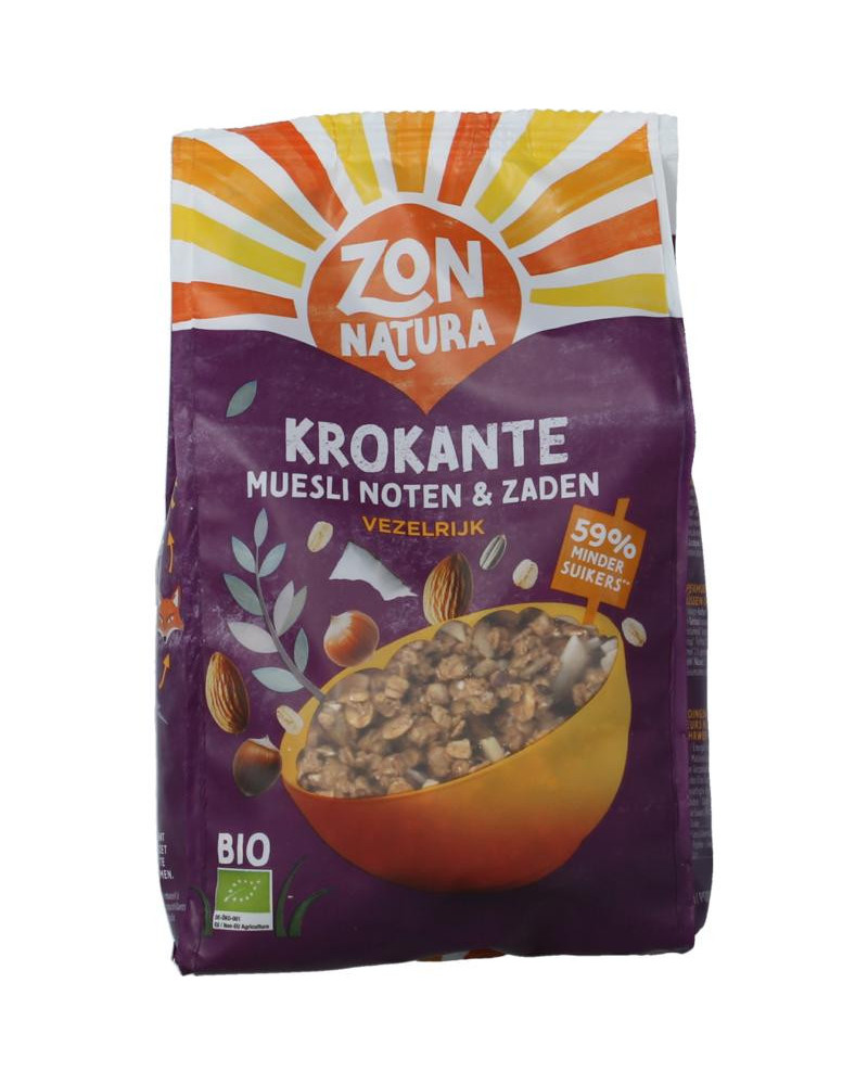 Volkoren HAVERvlokken* (gluten) 49%, zonnebloempitten* 8%, volkoren GERSTvlokken (gluten), HAVERbloem* 8%, zonnebloemolie* (zonnebloemolie*, anti-oxidant: tocoferolrijk extract), dadelsiroop*, gepofte rijst* (rijstmeel), stabilisator: acaciavezelpoeder*, lijnzaad* 3%, geroosterde kokosvlokken* 3%, geroosterde HAZELNOTEN* 3%, AMANDELEN (noten) 2%, kaneel*