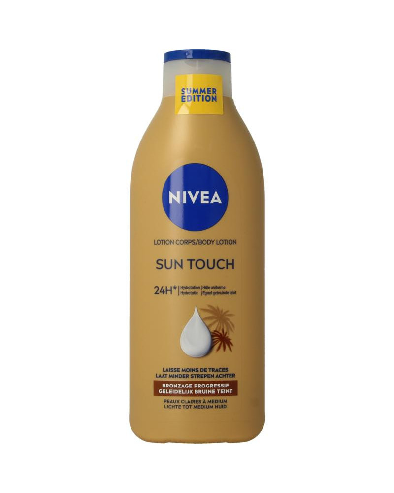 Hallo zomerse gloed! Deze NIVEA Body Lotion Sun Touch voor de lichte tot medium huidtinten laat de huid zacht aanvoelen en geeft een egaal gebruinde, natuurlijke teint met minder strepen. Hydrateert de huid tot 24uur* lang.