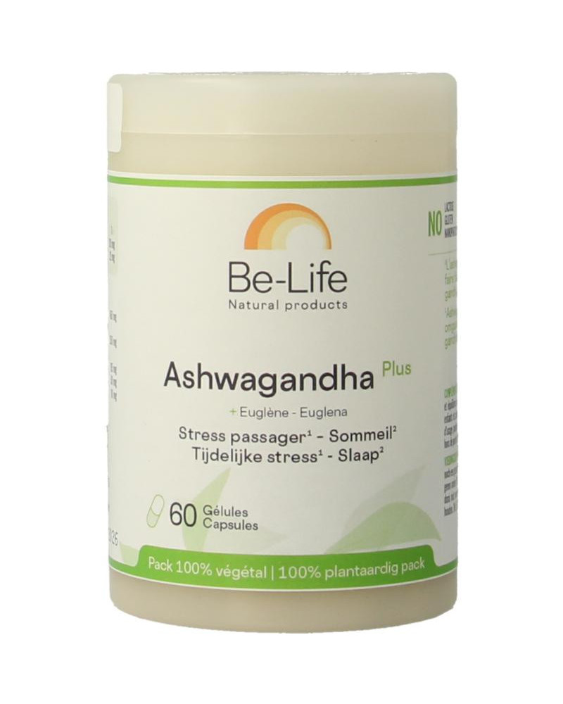 Ashwagandha wortelextract (withania somnifera L. Dunal)*, Gedroogde biomassa van Euglena gracilis algen, Glansmiddel (hydroxypropylmethylcellulose) (plantaardige capsule), Rijsteiwit (oryza sativa L)*, Glansmiddel: pectine