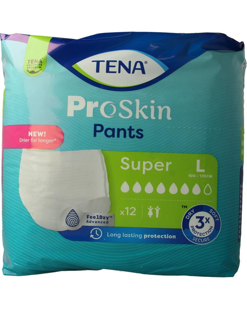 Tena Proskin pants super biedt zachte, comfortabele incontinentiebroekjes voor vrouwen en mannen, ideaal voor overdag en ’s nachts. In tegenstelling tot standaard verband voor volwassenen beschikt TENA ProSkin Pants over technologieën om vocht weg te leiden, te zorgen voor een droog gevoel en bescherming te bieden tegen doorlekken en ongewenste geurtjes. Dankzij FeelDry Advanced™ wordt vocht snel en effectief weggeleid van het oppervlak en de super absorberende kern sluit het vocht in voor een gezonde huid. Deze wegwerpbroekjes zijn gemaakt van ademende materialen die aanvoelen als textiel, met een uitstekende absorptie. Het broekje past net zo goed als normaal ondergoed en bevordert een onafhankelijk, actief dagelijks leven.