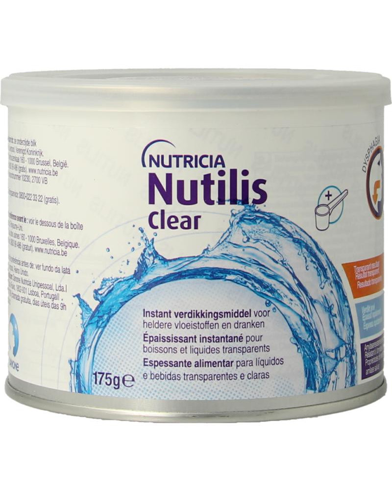 Dieetvoeding bij dysfagie. Nutilis Clear is een verdikkingsmiddel op basis van xanthaangom, geschikt voor het verdikken van voeding en vloeistoffen. Het is een poeder zonder geur en smaak wat snel verdikt. Ontwikkeld om de normale verschijningsvorm van vloeistoffen te behouden.