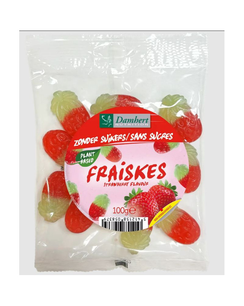Zoetstof (maltitolsiroop), zetmeel, voedingszuur (citroenzuur), aroma (aardbei), kleurend voedingsmiddel en plantenconcentraat (zwart wortelsap, saffloer, spirulina), glansmiddel (carnaubawax), zoetstof (steviolglycosiden uit stevia).
