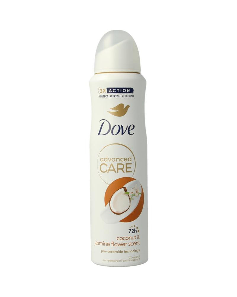 Dove Advanced Care Coconut & Jasmine Flower Anti-transpirant Spray heeft een uniek exotisch parfum van romige kokosnoot en heerlijk zacht jasmijn. Biedt 72 uur bescherming tegen zweet en geur en bevat ¼ hydraterende crème.