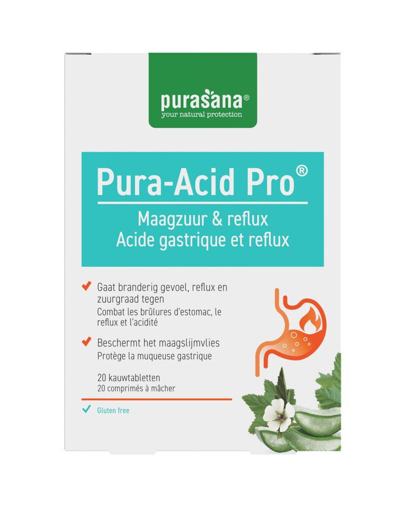 Pura-Acid Pro® is een medisch hulpmiddel dat verlichting biedt bij brandend maagzuur en reflux. Het neutraliseert overtollig maagzuur en beschermt tegelijkertijd de gevoelige slijmvliezen in de maag en slokdarm. De combinatie van mineralen en planten in de kauwtabletten met muntsmaak zorgt voor verlichting van zure oprispingen tot wel 4 uur lang.