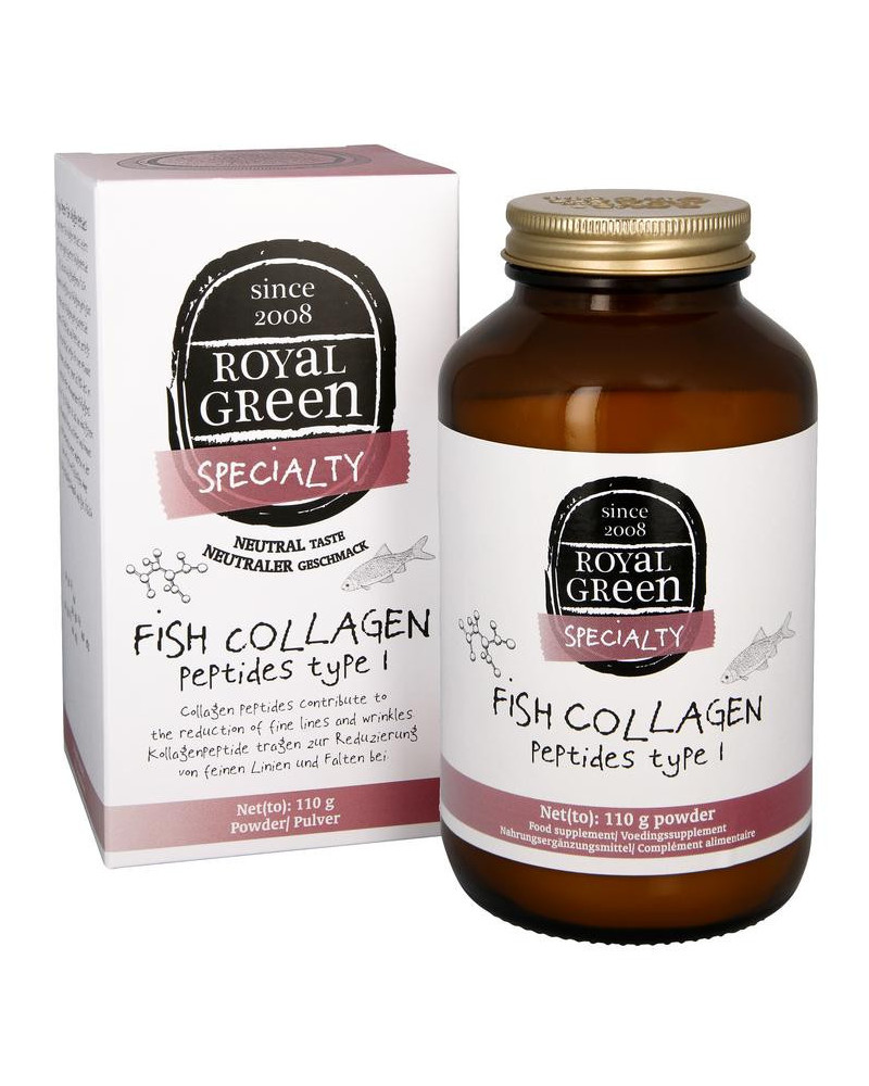 Royal Green Fish Collagen Peptide Type 1 Poeder (110 gram) bevat 100% zuivere, gehydrolyseerde collageenpeptiden type 1, afkomstig van wild gevangen vis.