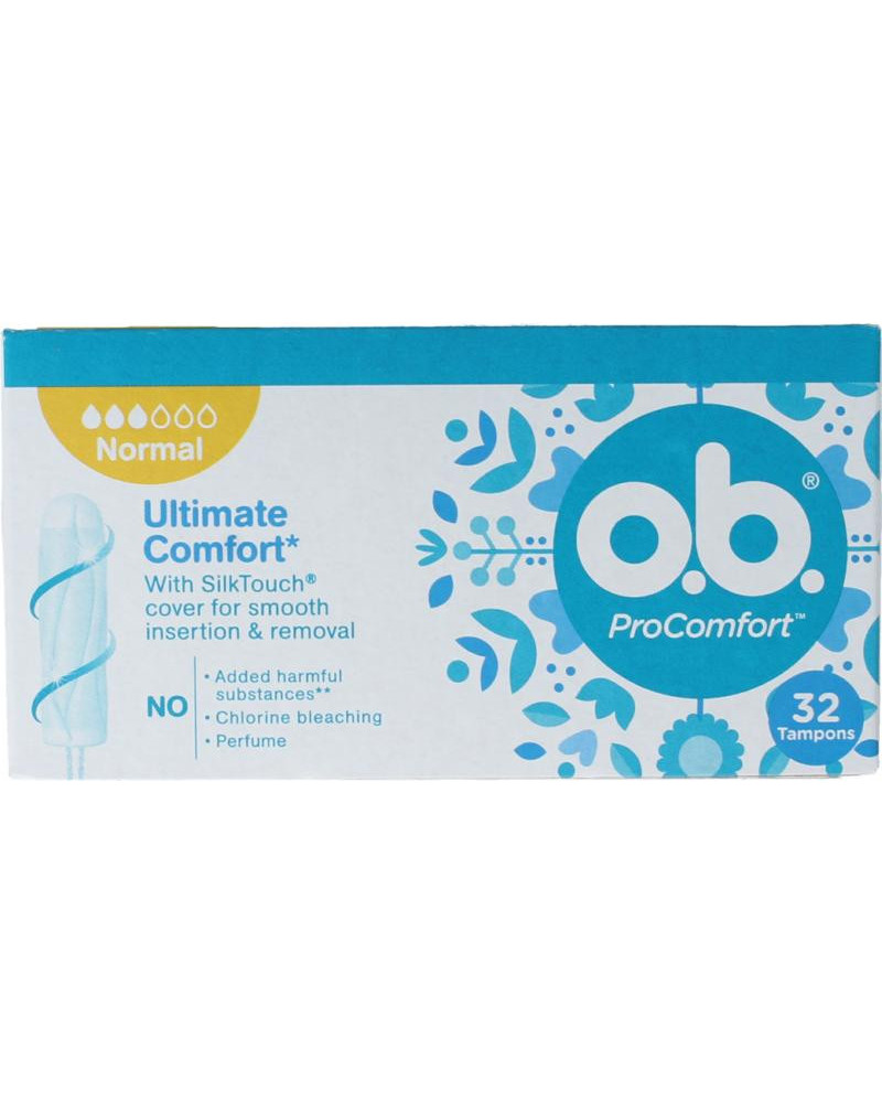 o.b.® ProComfort® Normal tampons met Dynamic Fit™ -technologie en SilkTouch®-oppervlak zorgen voor ultiem comfort* en betrouwbare bescherming voor de gemiddelde tot zware dagen van uw menstruatie (* binnen het o.b.®-assortiment). De Dynamic Fit-technologie met 3D-expansie zorgt ervoor dat de tampon zich op een natuurlijke wijze naar het lichaam vormt en de unieke in elkaar overlopende groeven helpen de vloeistof naar de kern van de tampon te leiden. Met SilkTouch oppervlak voor probleemloos inbrengen en verwijderen. De tampons zijn gynaecologisch getest, hebben een kern die 100% plantaardig is, zonder schadelijke chemische stoffen (o.a. pesticiden). o.b.® ProComfort® Normal tampons zijn chloor- en parfumvrij.