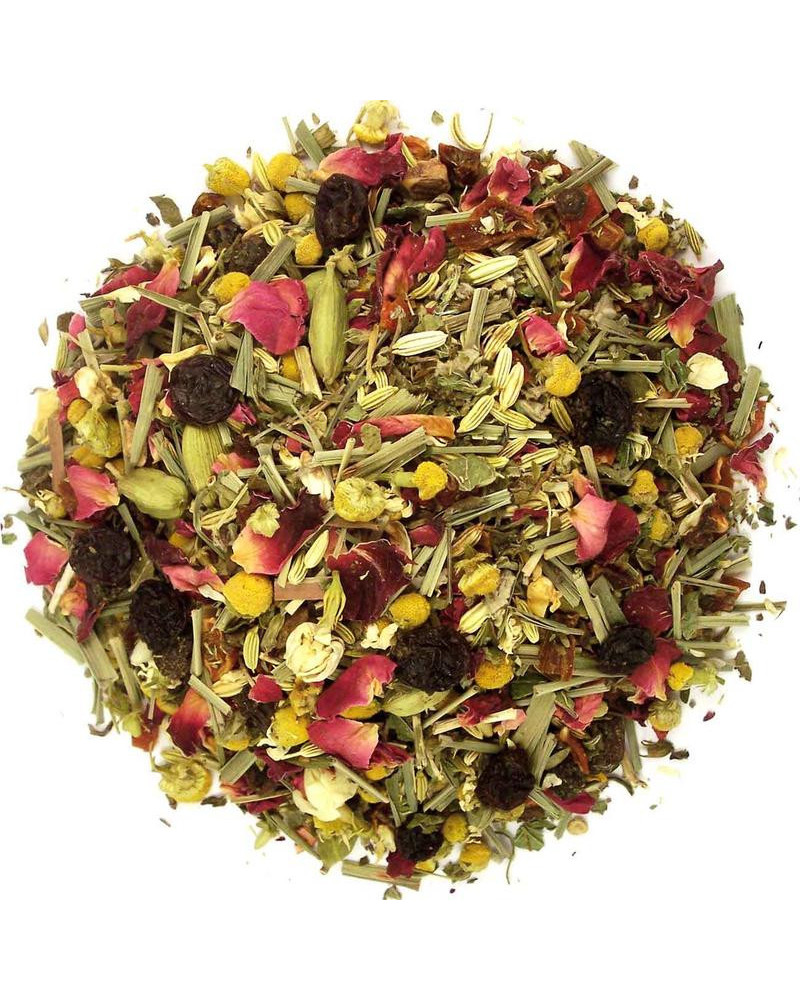 Druiven, melisse (citroenmelisse), rozenbottelschil, venkel, lemongrass, rozenbloesem, kardemom, kamillebloesem, pepermuntblaadjes, salieblaadjes, jasmijnbloesem, stukjes nootmuskaat.