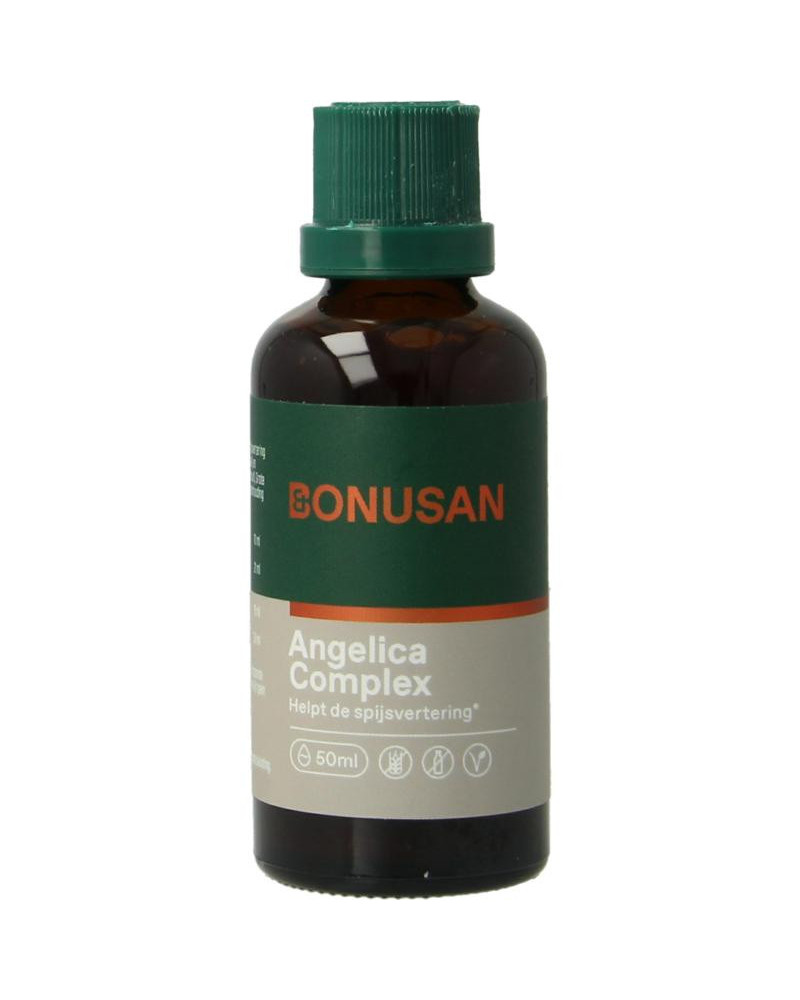Bonusan Angelica complex is een krachtige kruidenformule met een combinatie van onder andere grote engelwortel (Angelica archangelica) en echt duizendguldenkruid (Centaurium erythraea). Deze combinatie is zeer rijk aan bitterstoffen.