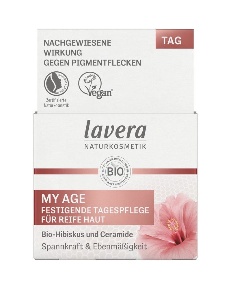 Ontdek de zorgvuldig uitgebalanceerde, natuurlijke compositie van My Age verstevigende dagcrème met biologische hibiscus en plantaardige ceramiden. Minimaliseert rimpels en geeft een stevige en gladde teint.