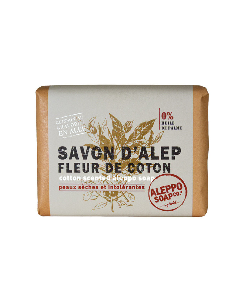 Aleppozeep, met de delicate geur van katoenbloem, is gevormd en verpakt in Frankrijk op basis van authentieke zeepvlokken uit Aleppo. De zeep bevat zuivere olijf- en laurierbesolie. Deze ''Aleppo" zit vol met krachtige actieve bestanddelen en is subtiel geparfumeerd met de geur van katoenbloesem.