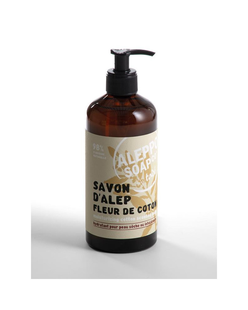 De echte ''Aleppo'' vloeibare zeep met een zachte katoengeur. Zeep van superieure kwaliteit reinigt de normale, gevoelige of rijpe huid voorzichtig.