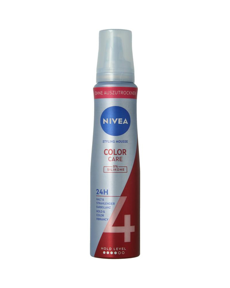 NIVEA Color Care & Protect Styling Mousse. Dankzij de unieke eigenschappen verlengt deze stylingformule de kleurlevendigheid en biedt tot 24 uur sterke fixatie.