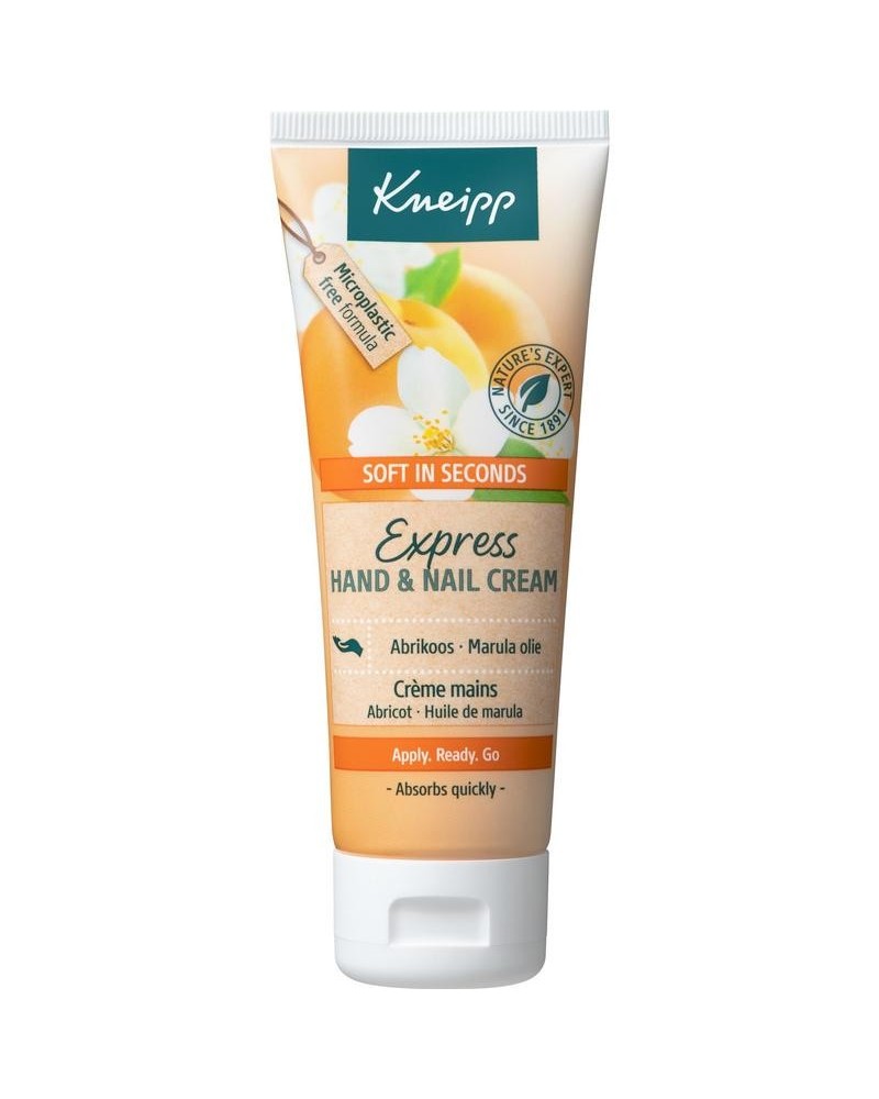 Fluweelzachte handen en verzorgde nagelriemen in enkele seconden. De Kneipp® Soft In Seconds Express handcrème en nagelcrème met plantaardige voedende formulering met hoogwaardig abrikozenmelkextract en natuurlijke marula-olie maakt je handen merkbaar zacht en soepel zonder een plakkerig gevoel achter te laten.
