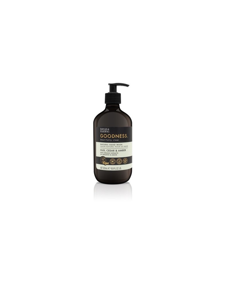 Baylis & Harding Goodness Hand Wash Oud, Cedar & Amber Hand Wash is een vloeibare handzeep met de aangename geur van cederhout en citrus. De oud, ceder en amber geur heeft een verfrissende en rustgevende mix van citrusvruchten. Kruiden en scherpe houtachtige ondertonen, verrijkt met biologische extracten van oregano en citroen, sandelhoutolie en patchoeli-olie maken van het wassen van de handen een moment om van te genieten.