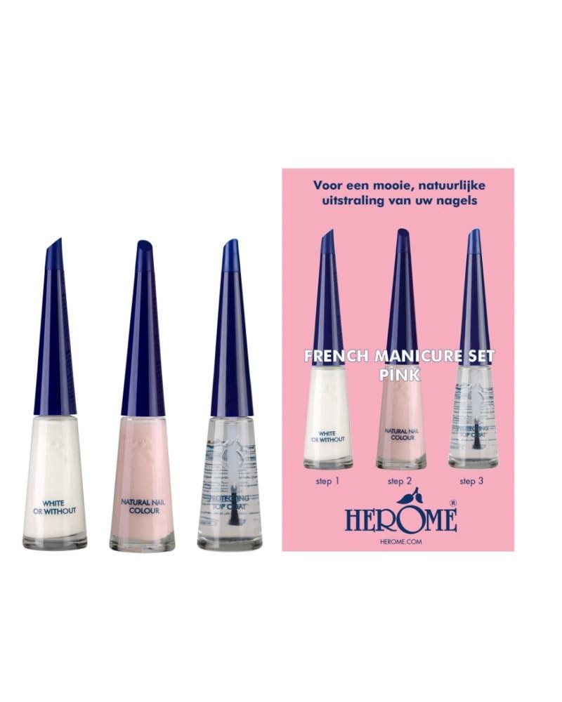 De Herôme French Manicure Set Pink zorgt voor parelwitte nagelranden en een fris roze nagelbed. Het inscheuren van slappe nagels wordt tevens voorkomen.