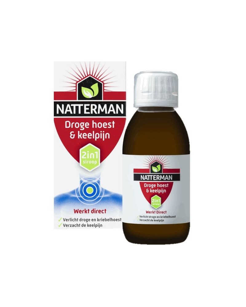 Natterman Droge hoest en Keelpijn siroop is een medisch hulpmiddel gebaseerd op het actieve ingrediënt Polysac-ActiveTM voor de behandeling en preventie van droge hoest en verlichting van keelpijn. Polysac-ActiveTM creëert een beschermende filmlaag achter in de keel. Het verzachtende effect geeft snel een gevoel van verlichting van droge hoestsymptomen en keelpijn. De siroop beschermt de slijmvliezen van de mond en keelholte tegen verdere irritatie. Door de keel te verzachten wordt de frequentie en ernst van de hoest verminderd en de hoestcyclus onderbroken.