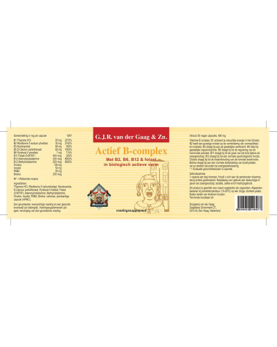 Van der Gaag B-complex Actief is een compleet en zorgvuldig uitgebalanceerd supplement dat alle acht B-vitaminen bevat, aangevuld met choline, inositol en PABA. Dankzij de gekozen vormen kan je lichaam de vitamines direct benutten: B2 als riboflavine-5-fosfaat, B6 als pyridoxal-5-fosfaat, folaat als 5-MTHF en B12 in beide actieve vormen, methylcobalamine én adenosylcobalamine.
