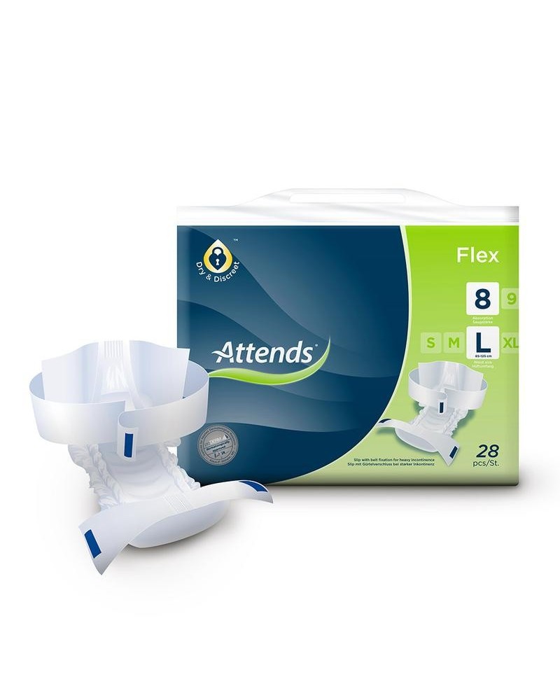Attends Flex zijn alles-in-één incontinentieverbanden met heupband geschikt voor zware urine- en/ of ontlastingsincontinentie.