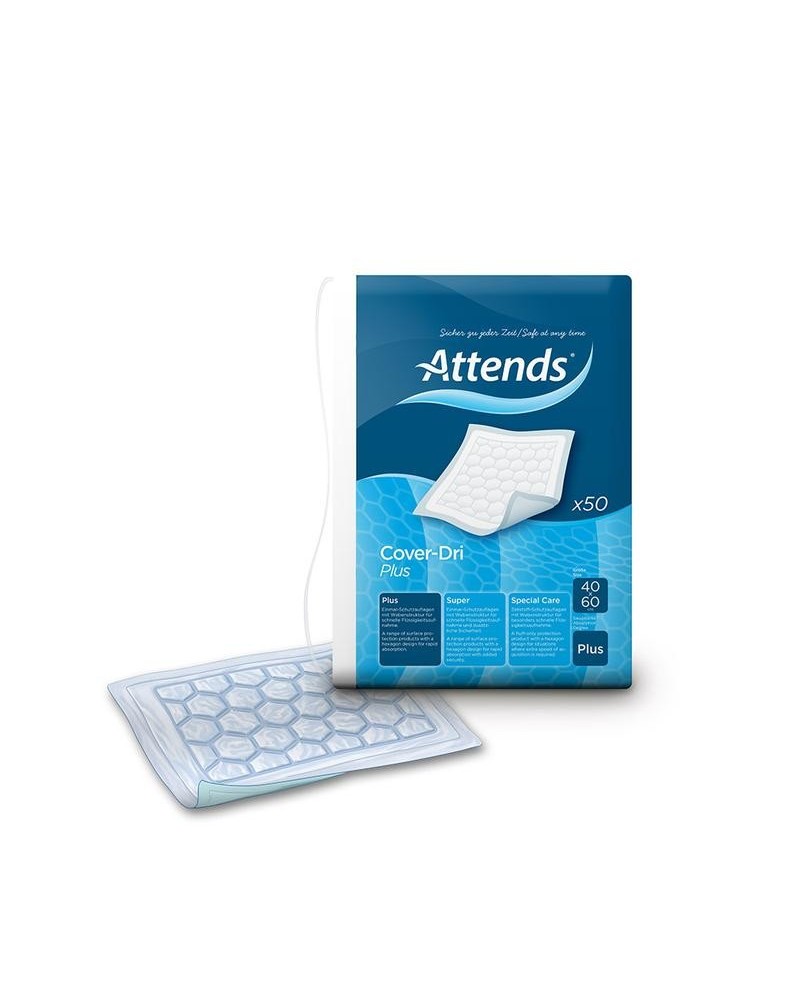 Attends Cover-Dri Plus met instopstroken zijn oppervlakte beschermende onderleggers, speciaal ontworpen voor lichte tot matige urine-incontinentie. Cover-Dri heeft een patroon van zeshoekige kussentjes, die fluff en superabsorberende bestanddelen bevatten. Vocht wordt hierdoor snel geabsorbeerd en ingesloten. De tussenliggende kanalen verdelen het vocht snel, zonder dat het zich op één plaats ophoopt. De anti-lekrand rondom het product helpt lekkage te voorkomen. Een lichtblauwe waterdichte onderkant zorgt ervoor dat de onderlegger op zijn plaats blijft.