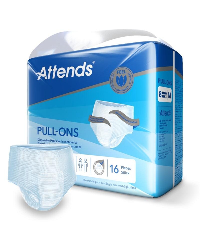 Attends Pull-Ons is een zacht en discreet broekje, dat u kunt dragen als normaal ondergoed. De wegwerpbroekjes kunnen gemakkelijk aan- en uitgetrokken worden en zijn ontworpen om zware incontinentie te beheersen. Attends Pull-Ons zorgen voor een superieure pasvorm en extra comfort. De sterk absorberende kern beschermt tegen doorlekken en geurtjes. Voor een actief leven met een veilig gevoel.