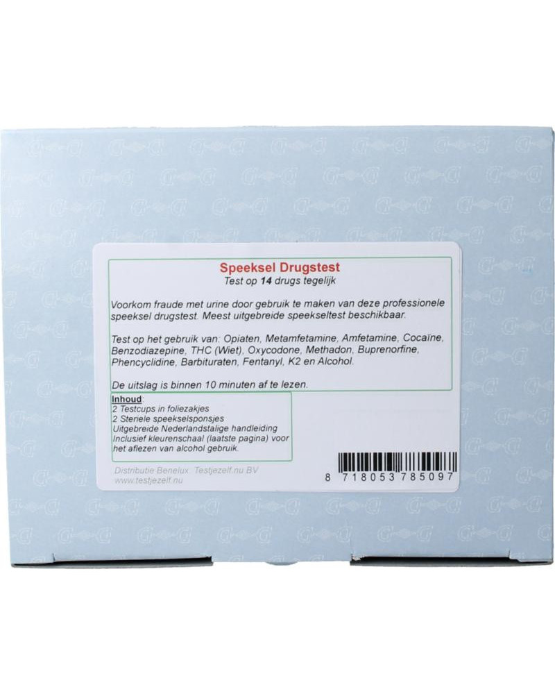 Drugstest op het gebruik van: Opiaten, Metamfetamine, Amfetamine, Cocaïne, Benzodiazepine, THC (Wiet), Oxycodone, Methadon, Buprenorfine, Phencyclidine, Barbituraten, Fentanyl, K2 en Alcohol.