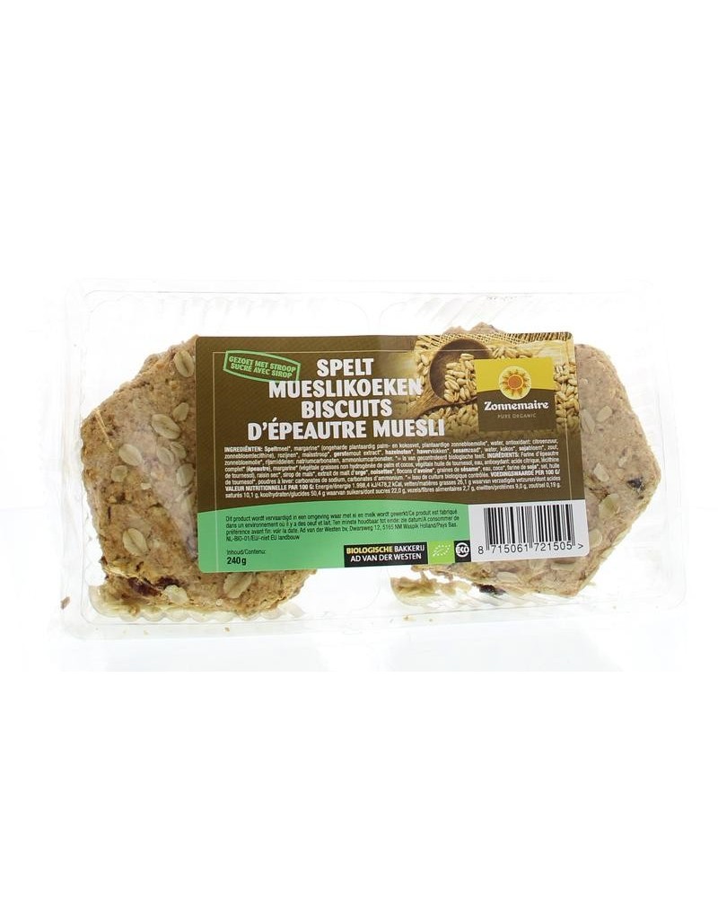 SPELTTARWEMEEL*, margarine* (geharde plantaardige palm- en kokosvet, plantaardige zonnebloemolie*, water, antioxidant: citroenzuur, zonnebloemlecithine), rozijnen*, maisstroop*, GERSTEMOUT extract*, HAZELNOTEN*, HAVERVLOKKEN* (gluten), SESAMZAAD*, water, kokos*, SOJABLOEM*, zout, zonnebloemolie*, rijsmiddelen en natriumcarbonaten.
