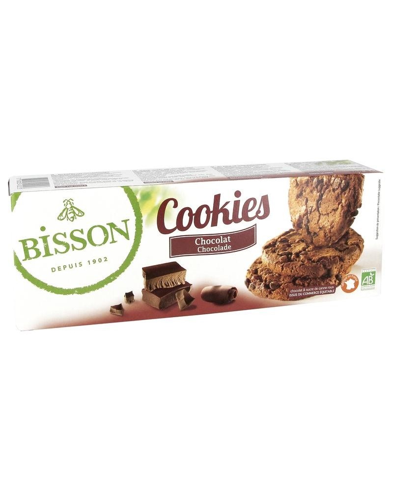 Bisson chocolade cookies met stukjes pure chocolade. Biologisch en een bron van vezels. Palmolie is afkomstig van duurzaam verbouwde teelt met respect voor het milieu (RSPO-1106065).