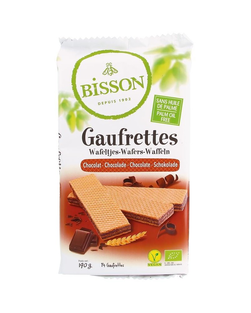 Biologische Bisson Wafels met chocolade zijn palmolievrij en bevatten 35% chocolade. Elke verpakking bevat 14 wafels.