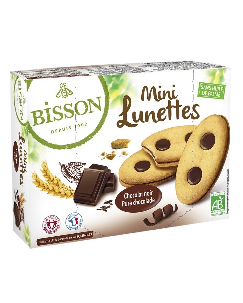 Bisson koekjes met een rijke chocoladevulling in de vorm van kleine brilletjes (Mini Lunettes). Biologisch en vrij van palmolie. Verpakt in drie zakjes à 2 koekjes.